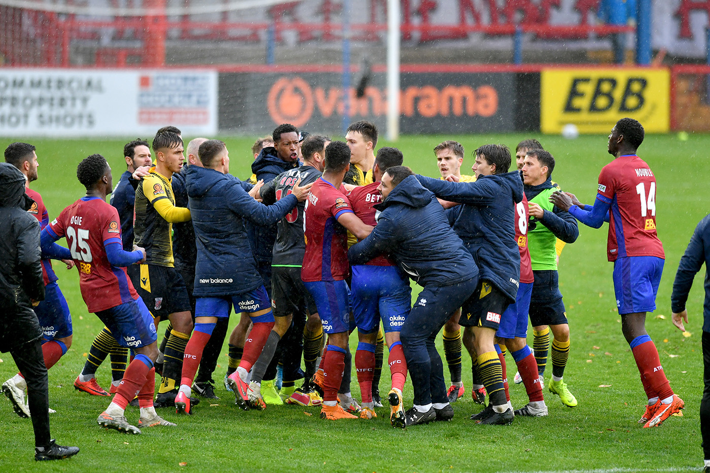 Max Kretzschmar’s goal won the game for Woking, sparking celebrations from The Cards at full-time. Searle took exception to Woking captain Josh Casey’s celebrations and stormed after him – triggering a melee between both sets of players and coaching staff.